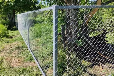 Забор из сетки рабицы один из недорогих и не нуждающихся в особом уходе вариантов со сроком службы не менее 15 лет. Он легко пропускает свет и воздух, подходит для участков с интенсивным озеленением и огородом.